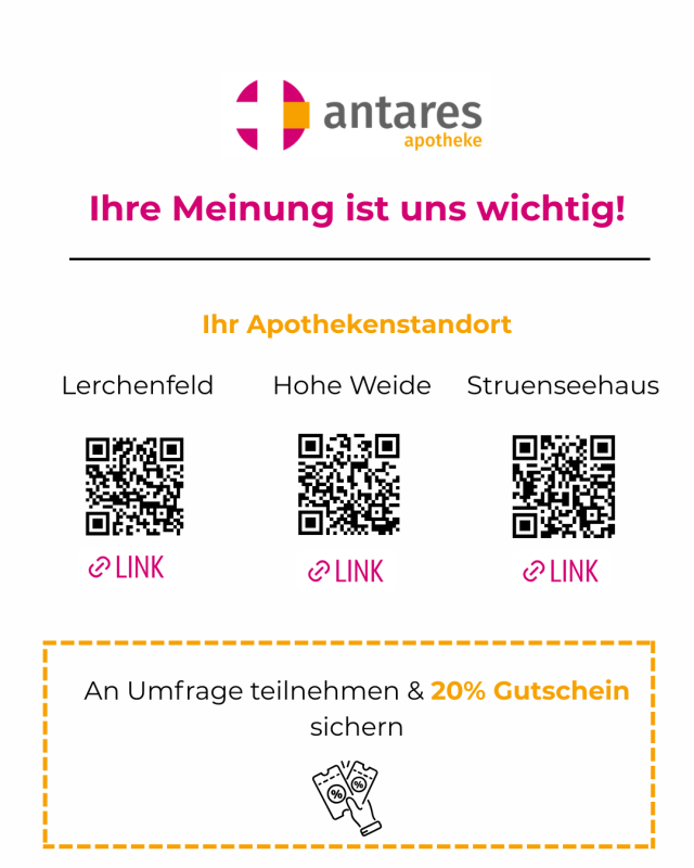 Für weitere Informationen kontaktieren Sie uns gerne per Telefon 040/31766650 oder Mail lerchenfeld@antares-apotheke.de